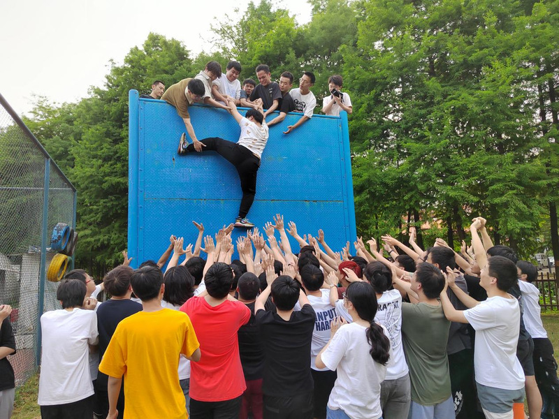 活动开始进行的是“破冰之旅”环节。在这个环节中,毕业生们进行开展了“抓住机遇”、“逢三抓手”、“急速追击”三个游戏,大家首先以对视、握手、打招呼等方式加深彼此印象,从羞涩变得热情。在接下来的游戏中,大家通过重复活动,制定目标,团队协作,分秒必争为目标奋斗,将活动推向高潮。“破冰之旅”环节让彼此之间培养了默契,让毕业生们体会到了团队协作与沟通的重要性。随后,毕业生们进行了“毕业墙”项目,在这个项目中,大家不可以借助外力和工具,须沿墙体正面爬上4.2米的高墙。大家在一起群策群力,思考出采用搭人梯方法挑战的方法。底部的同学采用马步站桩式,将身体背部靠在垂直墙面上,腰部挺直,用手臂固定保持人梯牢固;其他同学扶住人梯同学的腰,或者打开双手对攀爬同学进行保护;攀爬的同学在大家的保护下进行攀登,挑战目标。在这个项目中,有的毕业生主动出来甘当“人梯”,让其他人通过自己的血肉之躯帮助每一位从他们身上踏过的人翻过的高墙,同时,到达顶点的学生帮助未登顶的学生进行“翻越”。毕业生们互相帮助,将团队精神发挥到了极致。