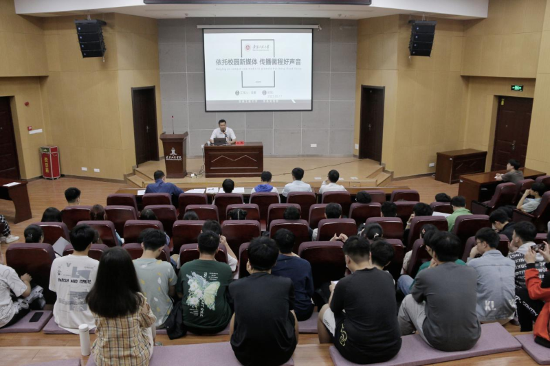 分享会上,吴鹏做了题为《依托校园新媒体 传播徽程好声音》经验交流。他从“抓热点、玩创意、拼技术、BGM”四个方面讲述了视频拍摄、剪辑、制作的技巧和方法,他启示同学们在新媒体平台上要注重“构思创作、素材剪辑、视频制作”等方面要素,要结合学院特色、专业知识、设计审美等角度展示建筑工程学院的特色风采。