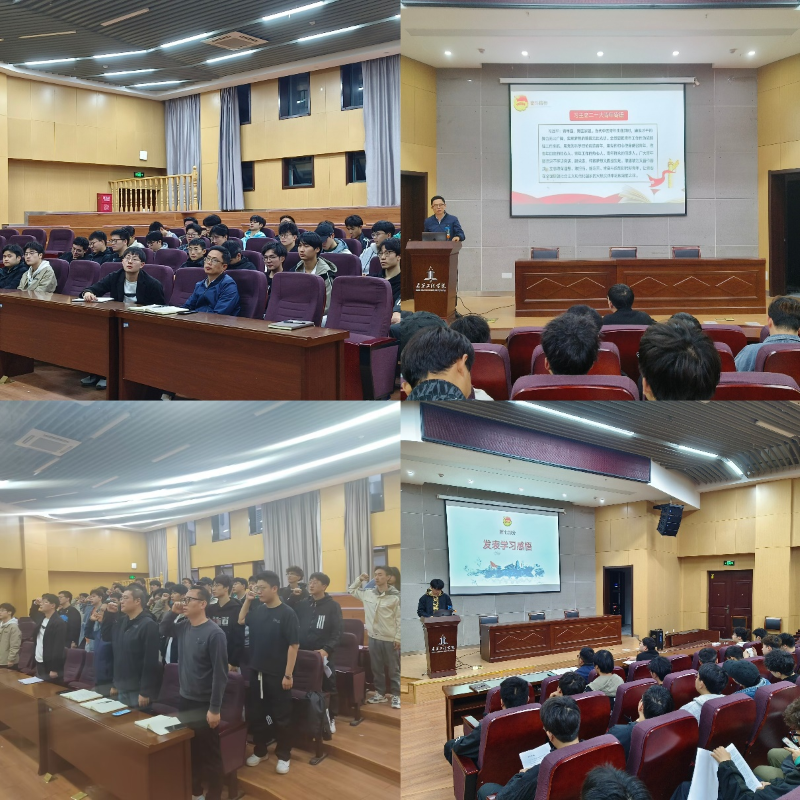 本次主题团日活动选取“强国复兴”专题,围绕“锤炼奋斗精神”,融合多种学习形式逐项开展。活动伊始,班级团支书带领大家学习奋斗精神的内涵、实践方法、模范事迹等知识。随后,尚玉强同学作为领誓人,带领全体团员面向团旗重温入团誓词,大家郑重承诺将遵守团的章程,执行团的决议,履行团员义务,严守团的纪律,铿锵有力的宣誓声表达着为共产主义事业奋斗终身的承诺。活动还邀请校青年讲师团成员为大家做了题为“明烛长耀红船处,青春献礼二十大”的宣讲。活动中还采用知识答题,视频观看等形式,学习了党团结带领全国人民走向复兴的伟大历史,并以各个寝室为学习小组,推选代表上台进行学习感悟分享,同学们纷纷表示将努力发扬奋斗精神,不畏艰难,克服险阻,争取为祖国的繁荣富强贡献自己的力量。