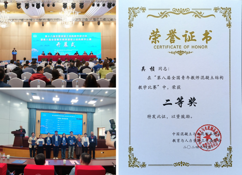 2024年4月19日至21日,由中国土木工程学会教育工作委员会、教育部高等学校土木工程专业教学指导分委员会、中国混凝土与水泥制品协会教育与人力资源工作委员会主办,合肥工业大学土木与水利工程学院承办的第十八届全国混凝土结构教学研讨会暨第八届全国青年教师混凝土结构教学比赛在合肥召开,吸引了来自清华大学、东南大学、浙江大学等全国300多位学者及青年教师参会。建筑工程学院院长曾磊、副院长曹兵等4人参加了此次研讨会,我院土木工程系教师吴桢在教学比赛中荣获二等奖。