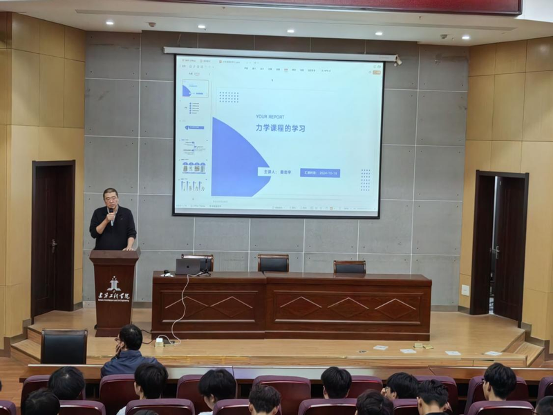 姜忠宇从日常生活中的力学现象出发,阐述了学习力学课程的重要性,指出了力学学习的难点所在,并就如何高效学习力学以及考试和评估方法等问题进行了详细讲解。通过回顾力学的发展历程和经典有趣的力学案例,姜忠宇激励同学们从事创新性研究,提出新的力学模型或探索解决方案,强调“知之者不如好之者,好之者不如乐之者”,提倡通过阅读相关书籍、观看科普视频等多种途径来培养对力学的兴趣,激发好奇心。同时,他强调学习力学应注重理解而非机械记忆,应通过公式推导和案例研究来深化对概念的理解,希望通过本次学习能够使同学们对力学知识有更深刻的把握,激发对专业知识学习的热情。廖斌强调力学课程的学习需要建立扎实的基础,建议同学们精读教材,对基本概念、定理和公式做到透彻理解,这是攻克力学难题的首要前提。同时,廖斌鼓励学生们积极参与课堂互动。他认为,课堂上与老师和同学的思想碰撞,能够激发学生对力学问题的深入思考,有助于开拓解题思路,并且强调了实验的重要性,将理论知识与实际应用紧密结合,从而更深刻地领悟力学原理。