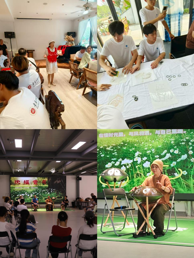“青年要用创意为传统文化赋予强大活力”,沈福村的非遗传承,正因这份创意从“静态展示”变为“动态生长”。沈福村的“福文化”源远流长。在古色古香的非遗工坊中,青年学子在这里与剪纸、蓝染、扎染邂逅。非遗传承人手把手带领青年学子剪出自己的“福”字,既有传统的厚重,又因青年的创意添了几分灵动。在蓝染与扎染的工坊里,洁白的布料在青年手中蜕变为生动的水墨画,让乡土美学有了更年轻的表达。手鼓与手碟的音浪,则是乡土共鸣最直接的表达,青年学子在聆听中感悟音乐与土地的联结,让乡土的声音走出村落,让更多人听见美好乡村建设的活力。团队成员以青春视角解读传统文化,用现代手段激活非遗活力,让“福文化”从历史深处走来,成为乡村文旅的核心吸引力。