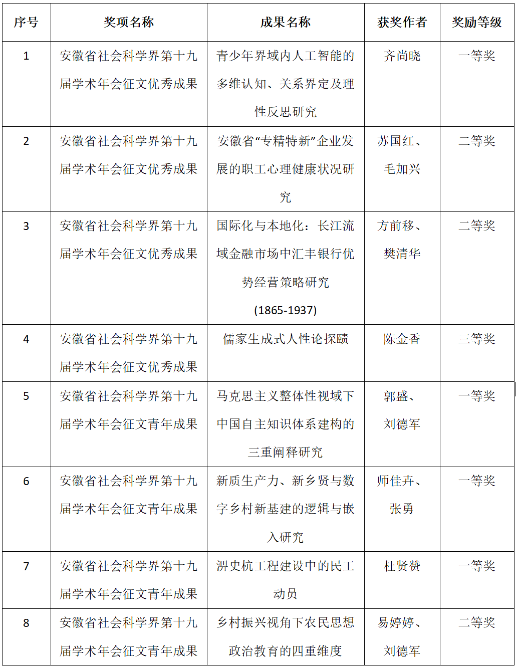 日前,安徽省社科联公布了省社会科学界第十九届(2024)学术年会获奖成果名单150项优秀成果和50项青年成果获得表彰。学院师生积极参与今年的学术年会征文活动,取得优异成绩共获得一、二、三等奖共计8项,其中,优秀成果一等奖1项、二等奖2项、三等奖1项;青年成果一等奖3项、二等奖1项。