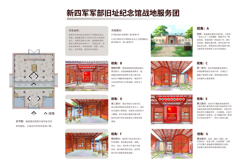 该地图全景展示了新四军军部旧址纪念馆战地服务团俱乐部旧址,素材包含“佑启人文”石质题额、“团结抗战、抗战到底”等抗战标语。地图分前言、战地服务团简介、战地服务团组织结构和主要人物介绍、知识分子踊跃参加新四军、新四军中知识青年的工作和成绩和结语等六部分内容,并通过“团结一致,共同抗日,保家卫国,共赴国难”主题口号对整个战地服务团精神进行总结。