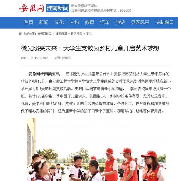 潘集区平圩镇庙新小学每个年级只有一个班,全校共计120名学生,其中留守儿童20名,建档立卡的贫困生8名。由于学校条件有限,非常缺乏音、体、美三门课程的任课教师。这批大学生的到来,得到了全校师生的热烈欢迎,他们传递给孩子们的不仅仅是艺术之美,更是青年的使命、担当和梦想。