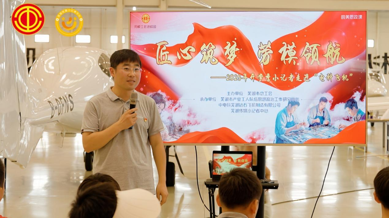 本期活动聚焦小学生群体,组织芜湖传媒小记者中心的40余名小学生记者走进中电科芜湖钻石飞机制造有限公司(以下简称“电科飞机”),以沉浸式体验教育为载体,让孩子们在亲眼所见、亲耳所闻、亲身感受中,传承和弘扬劳模精神、劳动精神、工匠精神。活动现场,小学生们在工作人员的悉心引导下,参观了电科飞机总装车间和机库。长三角大工匠、安徽工匠年度人物李勇为小朋友们分享了自己的成长故事。李勇以亲身经历鼓励孩子们努力学习、勇于探索。互动环节中,小朋友们踊跃提问,现场气氛热烈。